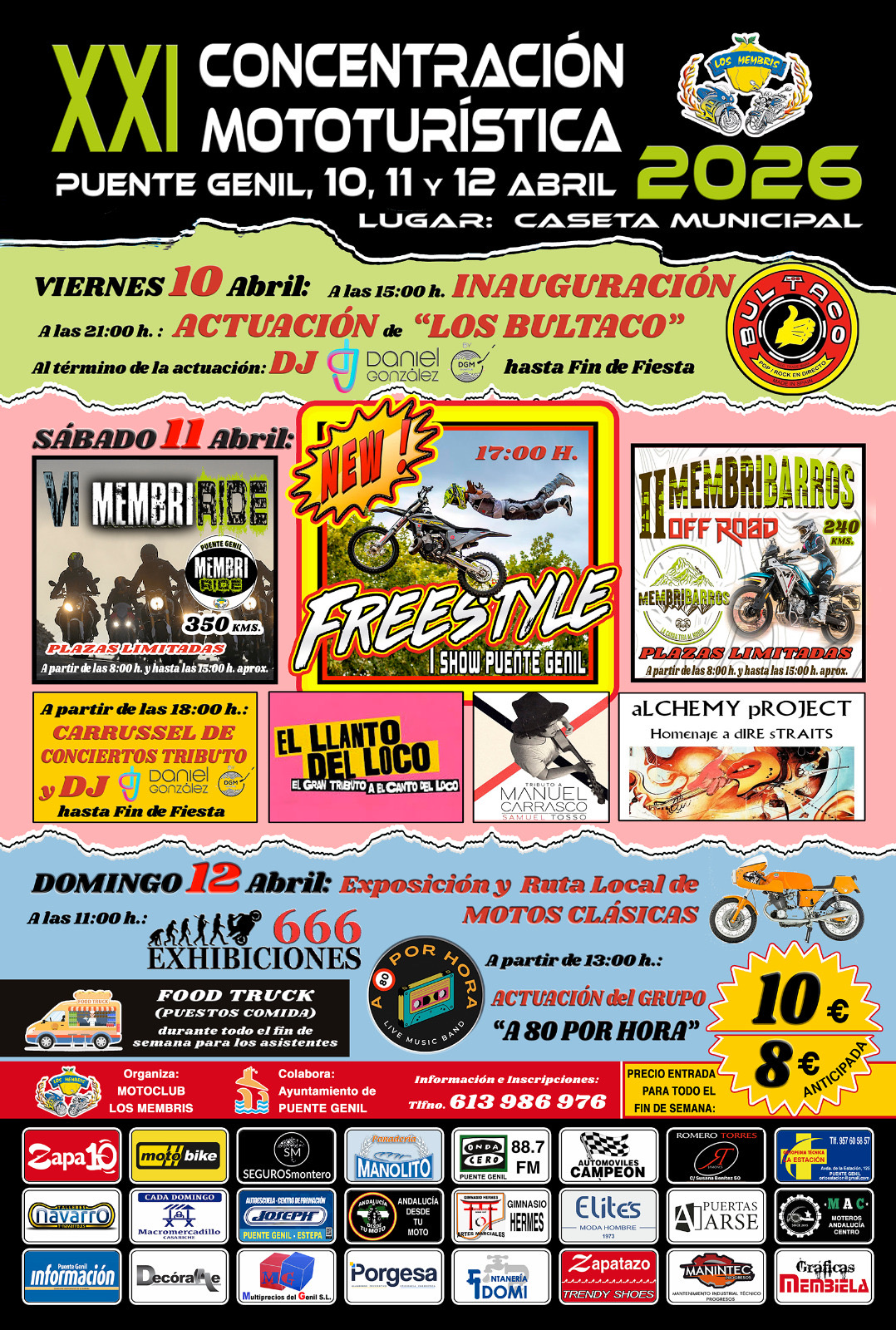 Organizada por el Motoclub Los Membris con la colaboración del Ayuntamiento de Puente Genil, esta concentración reunirá a motoristas y aficionados de toda España en la Caseta Municipal para disfrutar de un fin de semana lleno de actividades, música en directo y espectáculos.