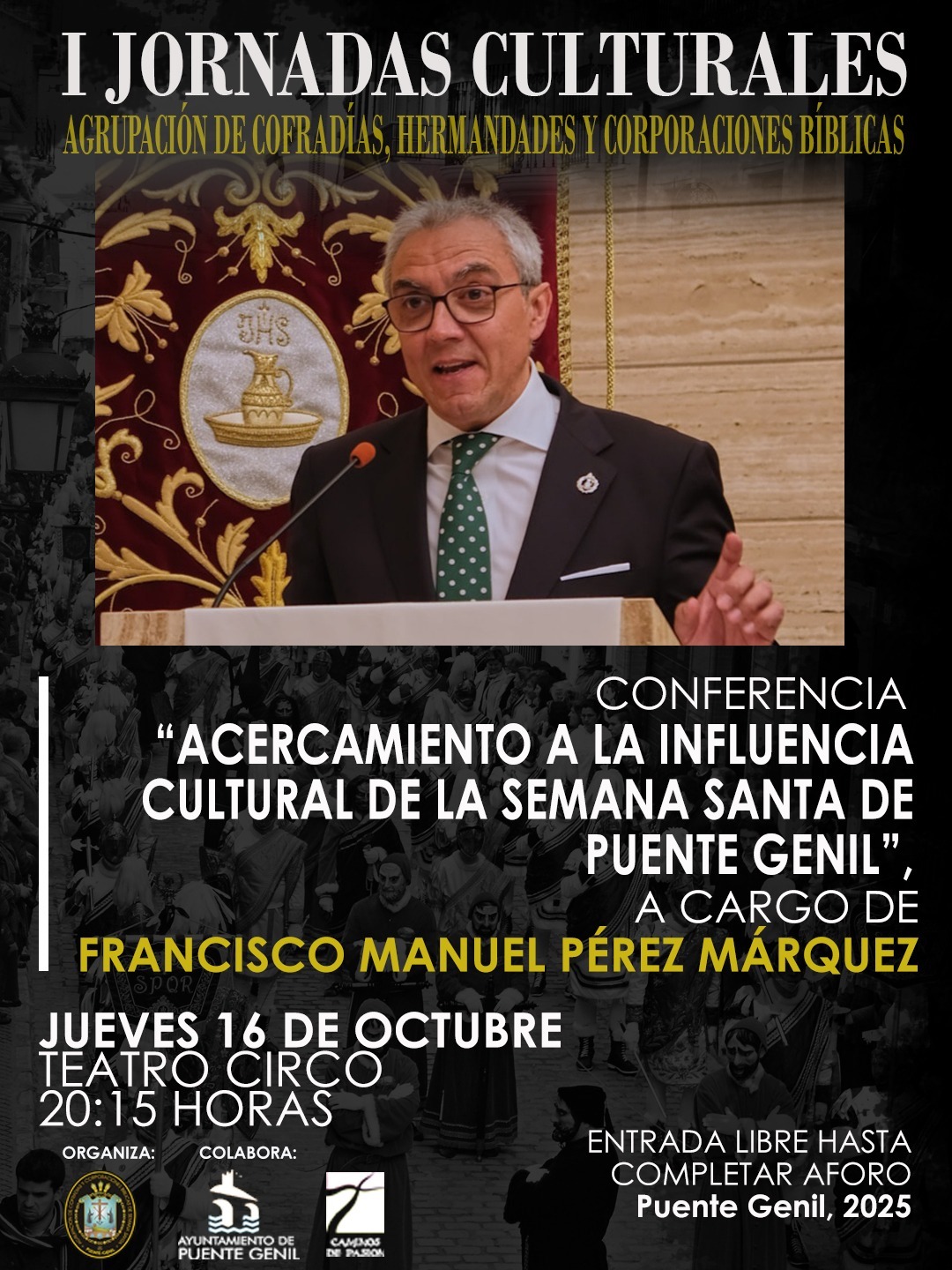 La Agrupación de Cofradías, Hermandades y Corporaciones Bíblicas de Puente Genil organiza las I Jornadas Culturales que se celebrarán del 16 al 19 de octubre. En su primera jornada, el día 16 a las 20:15h, Francisco Manuel Pérez Márquez nos deleitará con una Conferencia titulada "Acercamiento a la influencia cultural de la Semana Santa de…