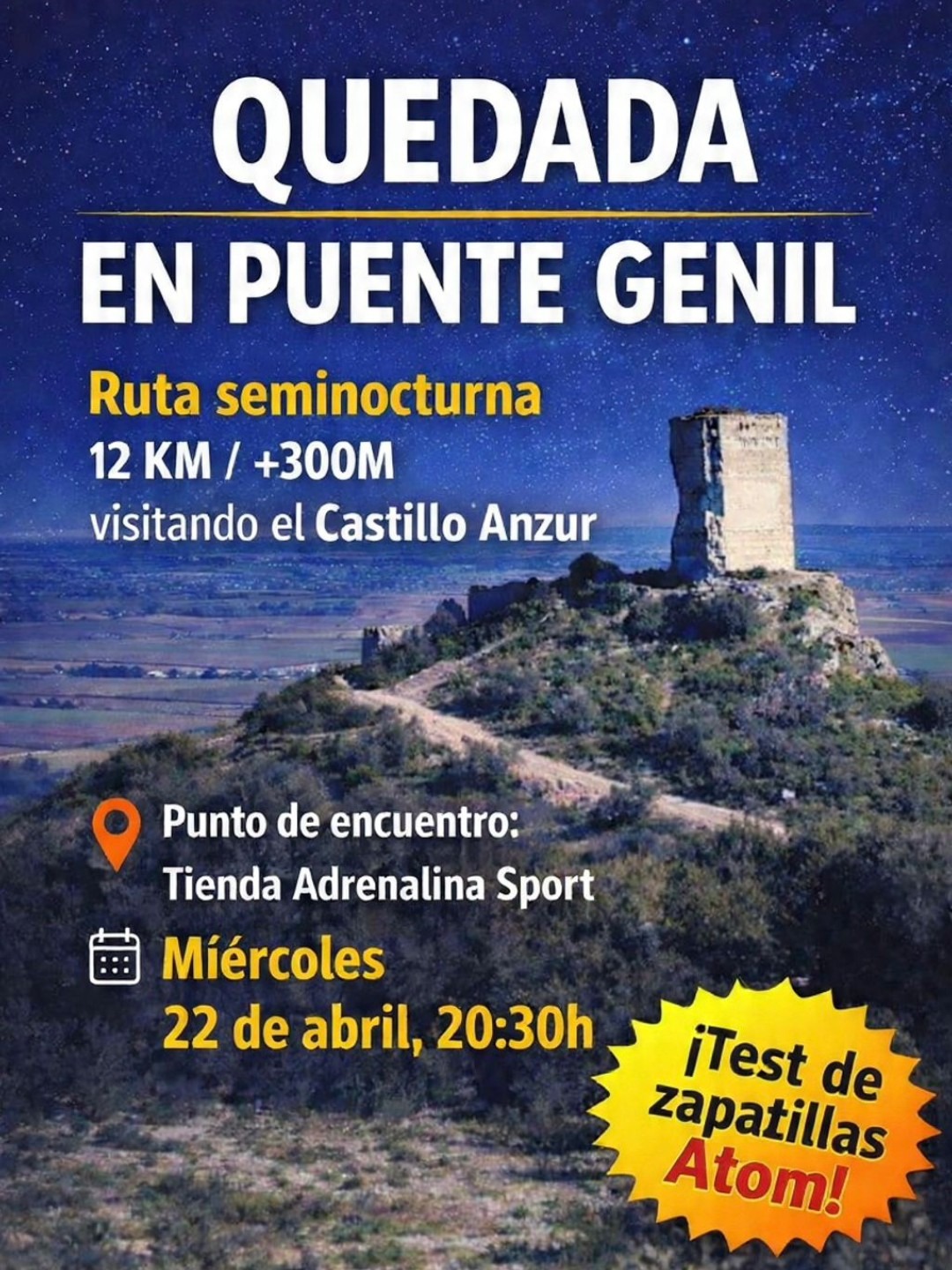 🌙🥾 ¡Nueva quedada en Puente Genil! Prepárate para una espectacular ruta seminocturna al Castillo Anzur y disfruta del deporte al aire libre en un entorno único. 📍 Punto de encuentro:…