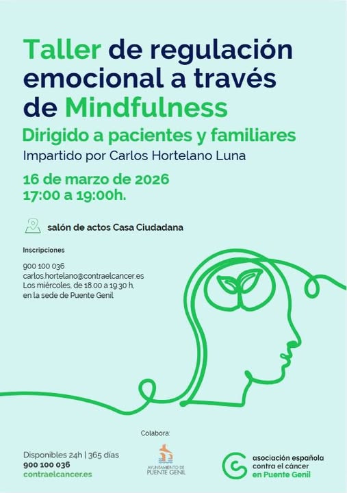 La Asociación Española Contra el Cáncer en Puente Genil, con la colaboración del Ayuntamiento de Puente Genil, te invita a participar en este taller dirigido a pacientes y familiares, impartido por Carlos Hortelano Luna, donde trabajaremos técnicas de mindfulness para mejorar el bienestar emocional 🌱