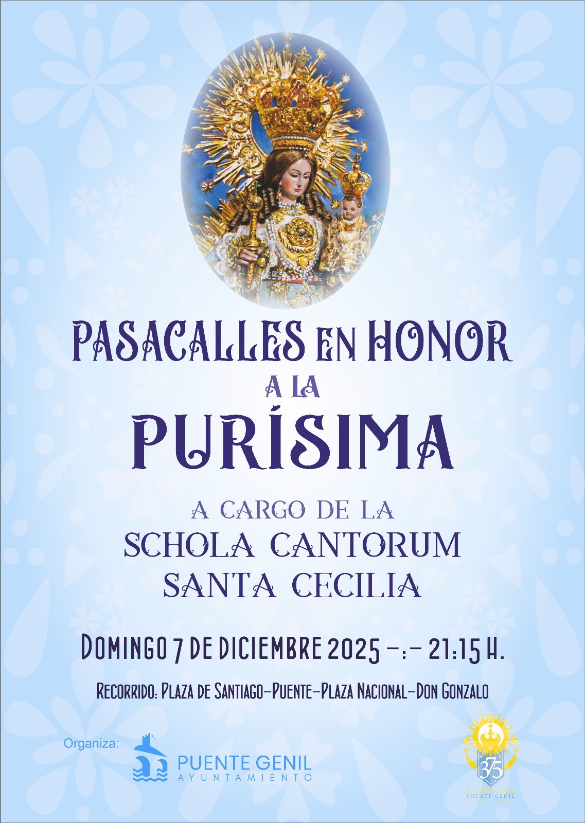 Este 📅domingo, 7 de diciembre, a partir de las ⏰21:15 h, la música y la devoción volverán a llenar nuestras calles de la mano de la Schola Cantorum Santa Cecilia.