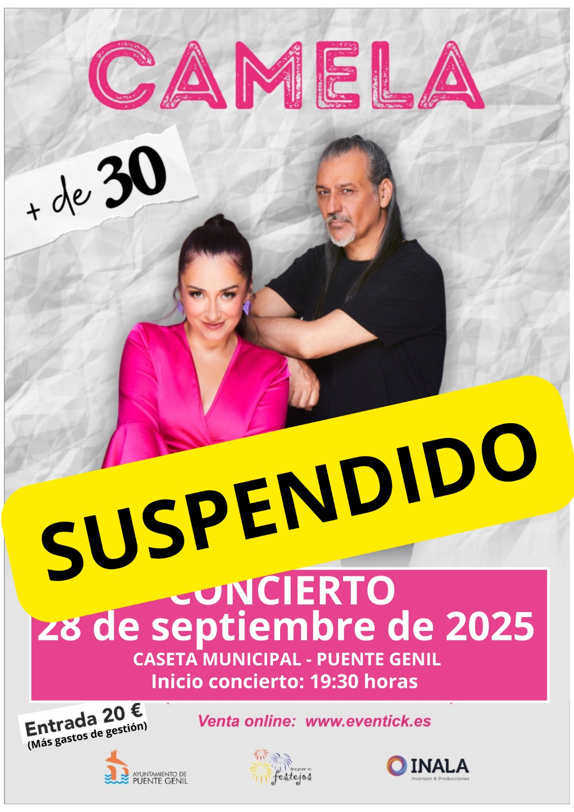 El Ayuntamiento de Puente Genil informa de la suspensión del concierto del grupo Camela, previsto para el próximo domingo 28 de septiembre en la Caseta Municipal, debido a la persistencia de los problemas de salud que padece Dionisio Martín “Dioni”, vocalista de la formación.