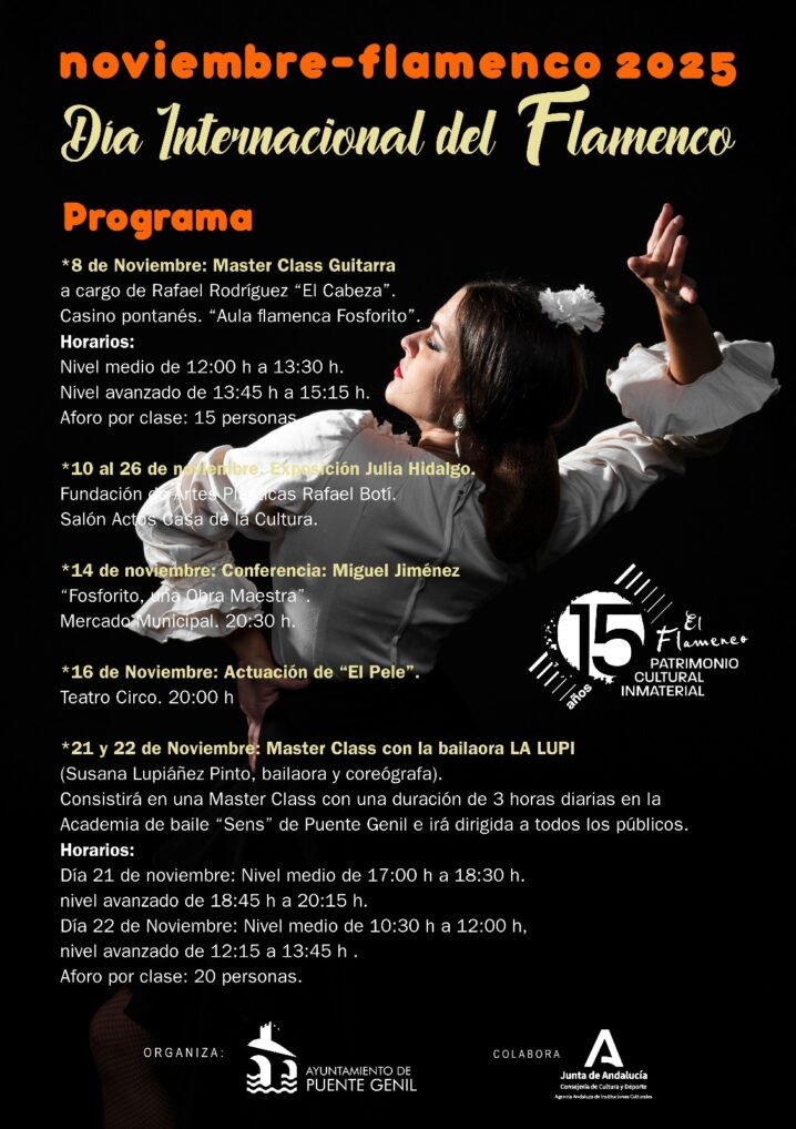 El Ayuntamiento de Puente Genil ha organizado una completa programación con motivo del Día Internacional del Flamenco, que se conmemora el 16 de noviembre con el título “Noviembre Flamenco 2025.”